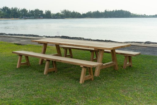 - Tafelblad: Het rechthoekige tafelblad is 200 cm lang en 100 cm breed, uitgevoerd in 5 cm dik massief premium teakhout. Deze dikte zorgt voor een indrukwekkende stabiliteit en duurzaamheid.