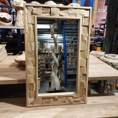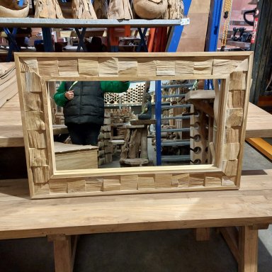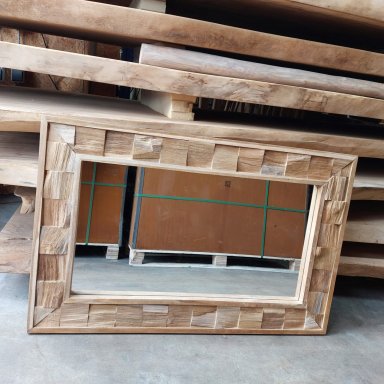 Spiegel in teakhout van 110 cm x 70 cm en 4 cm dik. De rand is gemaakt van teakstukjes.